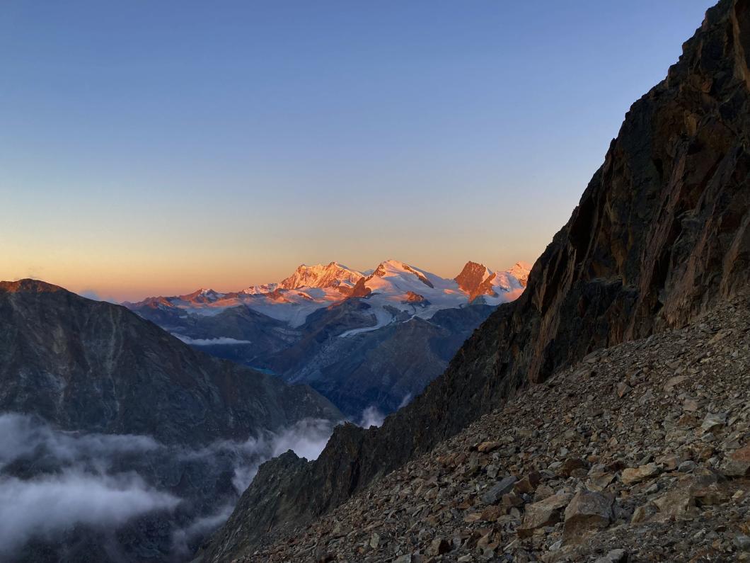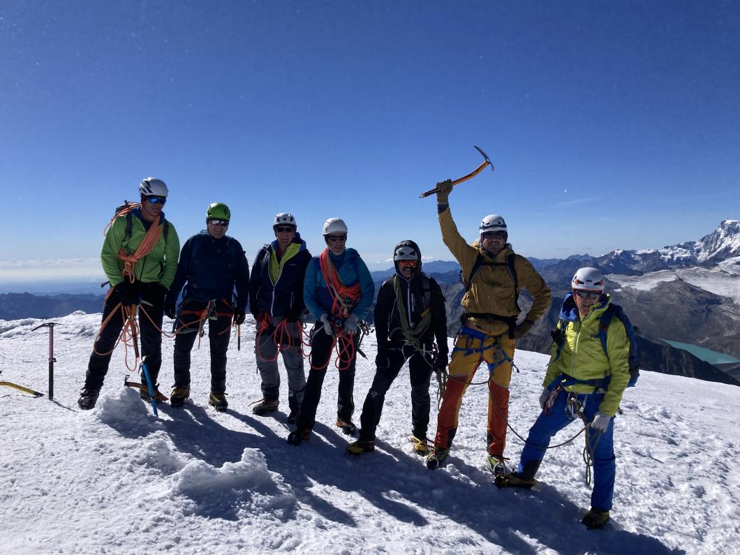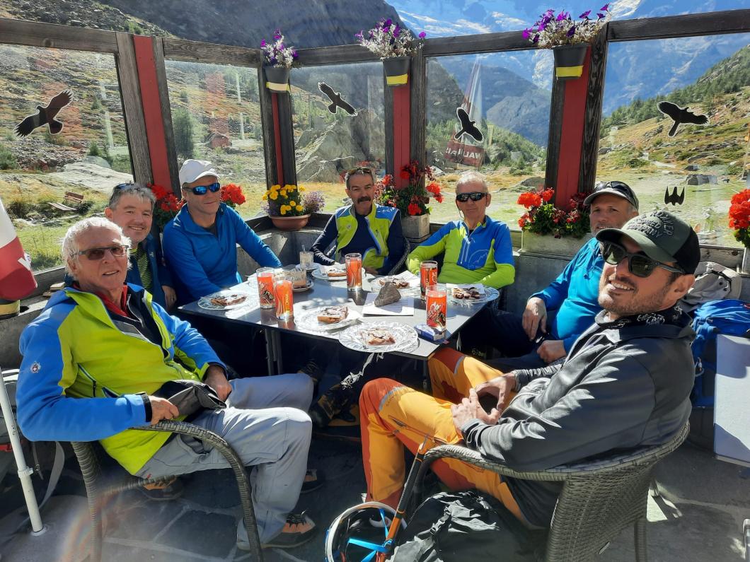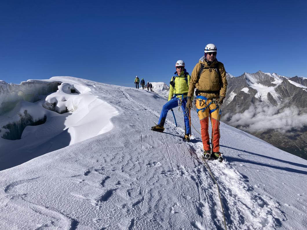 | Tourenbericht Am Samstag gegen Mittag und bei wunderbarem Wetter macht sich die siebenköpfige Truppe auf den Weg von Saas Almagell hoch auf die Almageller Hütte SAC. Nach einem kurzen Aufstieg durch den wunderschönen Pinienwald, erreichen wir das Platau der Almageller-Alp. Wir stärken uns und reservieren im Restaurant der Hütte sieben Stücke Früchtekuchen für den Abstieg am Sonntag – dieser soll ein Geheimtipp sein (laut Haueter!). Über einen wunderschönen Aufstieg erreichen wir zeitig unser Tagesziel und geniessen zusammen den Abend bevor es heisst Lichterlöschen! Um 4:45 werden wir unsanft – so wie es sich gehört – aus den Federn geholt. Aus dem Schlaf geweckt, wäre an meiner Stelle gelogen, denn diesen finde ich in der ganzen Nacht nur sehr selten. Nach dem Frühstück packen wir unsere sieben Sachen und begeben uns unter hellem Mond- und Stirnlampenlicht auf den Pfad in Richtung Rotgrad. Der Weg beginnt gleich mit einem Fels-Block Abschnitt, womit ein friedliches Vor-sich-hin-dösen ausgeschlossen ist. Gibt es was Schöneres, um in den Morgen zu starten? Wohl eher nicht… Gut aufgewärmt erreichen wir nach kurzer Zeit die Schlüssel-Stelle, welche eine kurze Kletterei (3) hoch zum Rotgrad beinhaltet. Ruckzuck befinden wir uns auf dem Namensgeber der Route und erklimmen Stück für Stück den roten Rücken des Weissmies. Das Wetter ist kaiserlich, kein Wölkchen weit und breit und die Sicht ist glasklar. Die Aussicht ist atemberaubend. Immer weiter dem Grad empor gelangen wir zum weissen Zuckerhut des Gipfels. Nun heisst es Pickel hervor und Eisen montieren. Als Stadtmensch, welcher ich nun mal bin, macht sich die Höhe langsam bemerkbar und das Atmen fällt mir nicht mehr ganz so leicht. Ein Schritt nach dem anderen lässt mich und die Gruppe dem Gipfel immer näher kommen und meinen inneren Schweinehund überwinden. Wie aus dem nichts, sind wir dann auf einmal auf dem Gipfel. Ein solches Erlebnis mit tollen Menschen, wunderschöner Landschaft und hammer Wetter. Genüsslich verzehre ich mein Essen und sammle Energie für den Abstieg. Da der Weg über die Schneefläche in Richtung Saas-Grund leider nicht passierbar ist, müssen wir über die Normalroute zurück zur SAC-Hütte absteigen. Nach einer kurzen Pause in selbiger, beginnt die Wanderung hinab auf die Almagelleralp. Tatsächlich hat die Reservierung der Kuchen geklappt und wir geniessen die Stücke – wohlbemerkt ohne Rahmtopping – mit einem grossen Glas Rivella. Hat ein Kuchen schon mal besser geschmeckt? Wohl eher nicht… Ich gebe zu, nun wäre ich gerne bereits unten, doch es liegt noch eine gute Stunde Wanderung hinab nach Almagell vor uns. Auch diese meistern wir stoisch. Überglücklich und müde kommen wir an diesem Abend in Almagell an. Alle gesund und heil. Ich war noch nie so dermassen KO und überglücklich zugleich. Vielen Dank euch 6 Gspänli - es war der Hammer! Euer Basler-Läggerli Bericht: Beat Schwald |