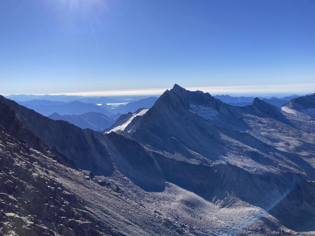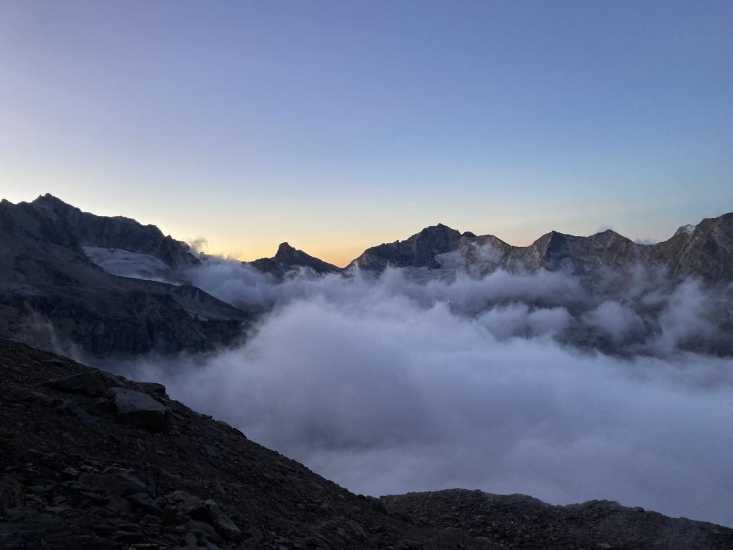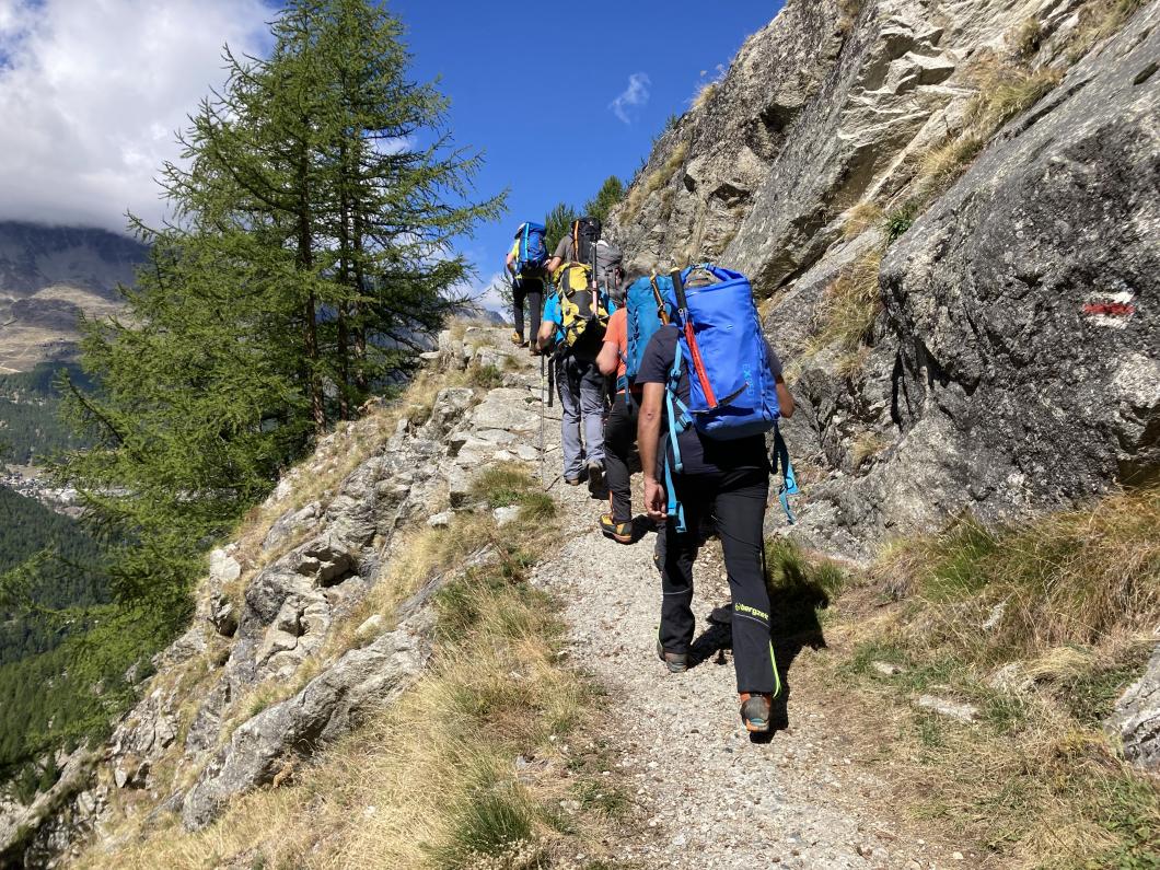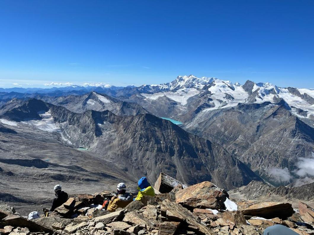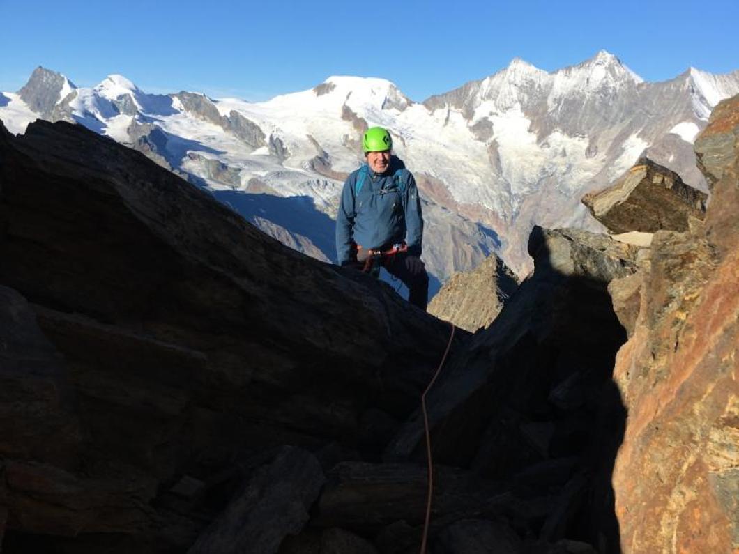 | Tourenbericht Am Samstag gegen Mittag und bei wunderbarem Wetter macht sich die siebenköpfige Truppe auf den Weg von Saas Almagell hoch auf die Almageller Hütte SAC. Nach einem kurzen Aufstieg durch den wunderschönen Pinienwald, erreichen wir das Platau der Almageller-Alp. Wir stärken uns und reservieren im Restaurant der Hütte sieben Stücke Früchtekuchen für den Abstieg am Sonntag – dieser soll ein Geheimtipp sein (laut Haueter!). Über einen wunderschönen Aufstieg erreichen wir zeitig unser Tagesziel und geniessen zusammen den Abend bevor es heisst Lichterlöschen! Um 4:45 werden wir unsanft – so wie es sich gehört – aus den Federn geholt. Aus dem Schlaf geweckt, wäre an meiner Stelle gelogen, denn diesen finde ich in der ganzen Nacht nur sehr selten. Nach dem Frühstück packen wir unsere sieben Sachen und begeben uns unter hellem Mond- und Stirnlampenlicht auf den Pfad in Richtung Rotgrad. Der Weg beginnt gleich mit einem Fels-Block Abschnitt, womit ein friedliches Vor-sich-hin-dösen ausgeschlossen ist. Gibt es was Schöneres, um in den Morgen zu starten? Wohl eher nicht… Gut aufgewärmt erreichen wir nach kurzer Zeit die Schlüssel-Stelle, welche eine kurze Kletterei (3) hoch zum Rotgrad beinhaltet. Ruckzuck befinden wir uns auf dem Namensgeber der Route und erklimmen Stück für Stück den roten Rücken des Weissmies. Das Wetter ist kaiserlich, kein Wölkchen weit und breit und die Sicht ist glasklar. Die Aussicht ist atemberaubend. Immer weiter dem Grad empor gelangen wir zum weissen Zuckerhut des Gipfels. Nun heisst es Pickel hervor und Eisen montieren. Als Stadtmensch, welcher ich nun mal bin, macht sich die Höhe langsam bemerkbar und das Atmen fällt mir nicht mehr ganz so leicht. Ein Schritt nach dem anderen lässt mich und die Gruppe dem Gipfel immer näher kommen und meinen inneren Schweinehund überwinden. Wie aus dem nichts, sind wir dann auf einmal auf dem Gipfel. Ein solches Erlebnis mit tollen Menschen, wunderschöner Landschaft und hammer Wetter. Genüsslich verzehre ich mein Essen und sammle Energie für den Abstieg. Da der Weg über die Schneefläche in Richtung Saas-Grund leider nicht passierbar ist, müssen wir über die Normalroute zurück zur SAC-Hütte absteigen. Nach einer kurzen Pause in selbiger, beginnt die Wanderung hinab auf die Almagelleralp. Tatsächlich hat die Reservierung der Kuchen geklappt und wir geniessen die Stücke – wohlbemerkt ohne Rahmtopping – mit einem grossen Glas Rivella. Hat ein Kuchen schon mal besser geschmeckt? Wohl eher nicht… Ich gebe zu, nun wäre ich gerne bereits unten, doch es liegt noch eine gute Stunde Wanderung hinab nach Almagell vor uns. Auch diese meistern wir stoisch. Überglücklich und müde kommen wir an diesem Abend in Almagell an. Alle gesund und heil. Ich war noch nie so dermassen KO und überglücklich zugleich. Vielen Dank euch 6 Gspänli - es war der Hammer! Euer Basler-Läggerli Bericht: Beat Schwald |